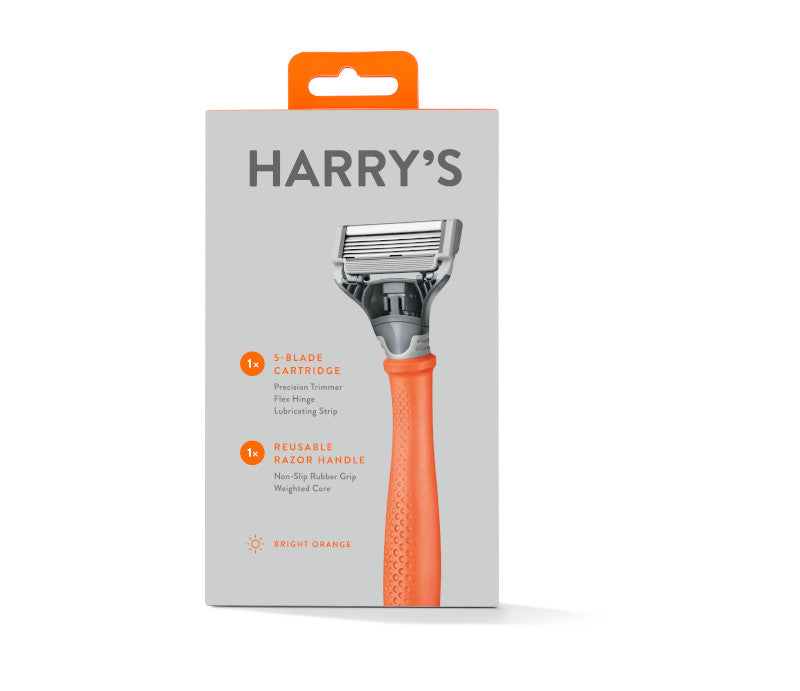 Featuring a rubberised handle for maximum grip. even when wet. Harry's Bright Orange Truman Razor Handle makes for a close. comfortable shave. The Truman Handle is slightly weighted for improved performance as the blades sit closer to the skin.